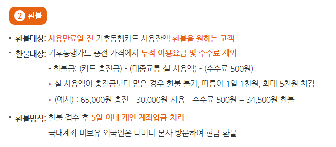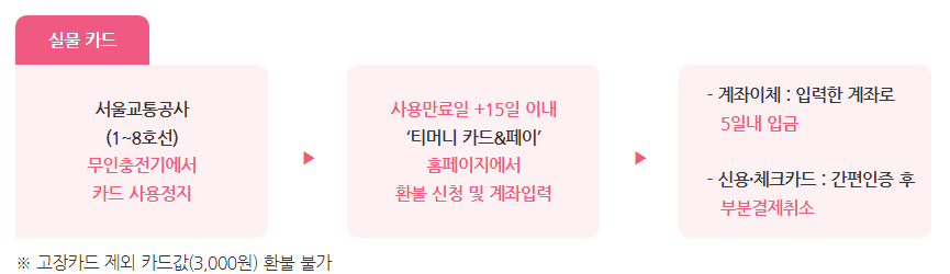 일정에 변동이 생겨서 충전한 날까지 다 사용하지 못하는 경우 환불도 가능합니다. 무인충전기에서 카드 사용정지를 신청하고 15일 이내에 '티머니 카드&페이' 홈페이지에서 환불 신청 및 계좌입력을 통해 환불받으실 수 있습니다.